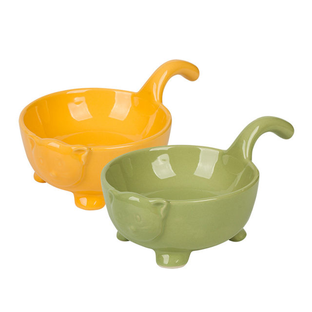 Accueil » Des produits » Appareil pour animaux de compagnie » Bol pour animaux de compagnie » avec tête de chat en relief avec longue queue et bol pour chat de quatre pieds Mangeoire en céramique jaune bleu vert